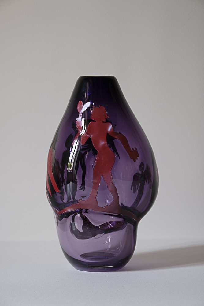 Didier Tisseyre travaille la forme du vase comme une surface à raconter. Le verre devient pour lui une surface d’expérimentation. Ses figures filiformes, silhouettes suspendues, habitent l’objet comme un théâtre intime. Lentement, elles deviennent figures, personnages, oiseaux, fragments d’histoires. Ses personnages semblent être pris dans la masse, flottants, où s’installent entre eux un dialogue silencieux.