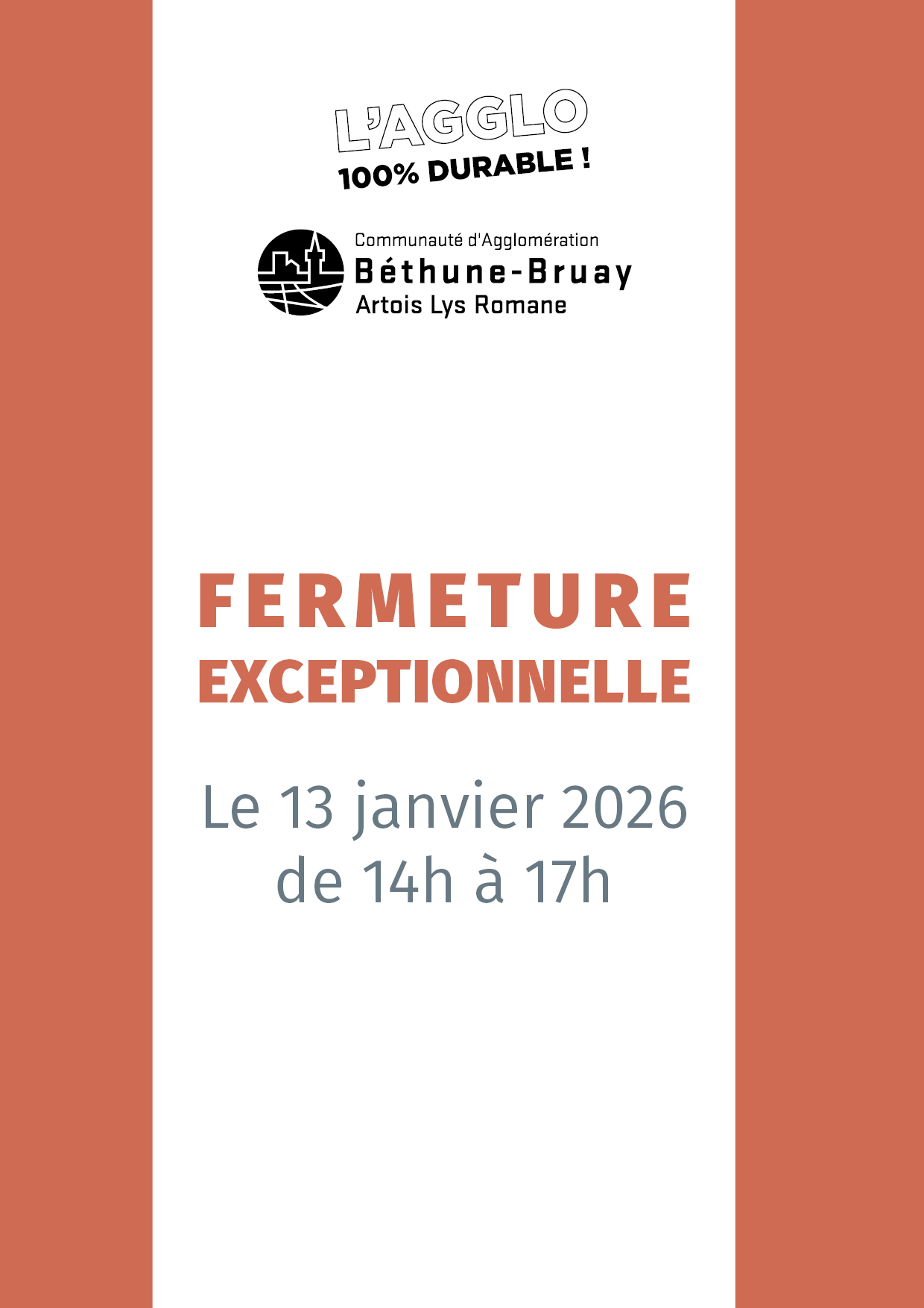 Les services et équipements de l’Agglomération (y compris les déchetteries) seront exceptionnellement fermés : le mardi 13 janvier 2026, de 14h à 17h.